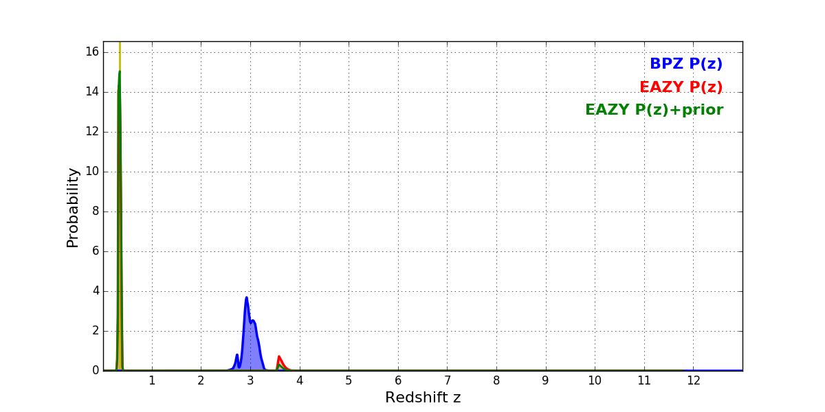 In P(z) plots: Yellow lines mark the cluster redshift z = 0.341,