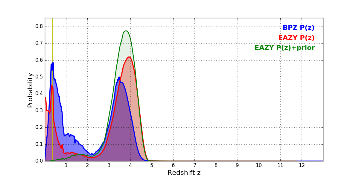 In P(z) plots: Yellow lines mark the cluster redshift z = 0.341,