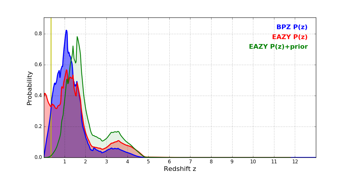 In P(z) plots: Yellow lines mark the cluster redshift z = 0.341,