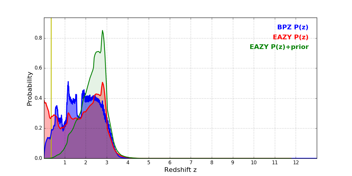 In P(z) plots: Yellow lines mark the cluster redshift z = 0.341,