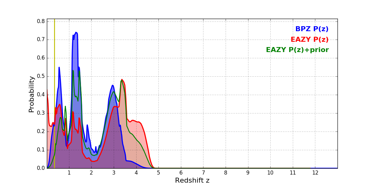 In P(z) plots: Yellow lines mark the cluster redshift z = 0.341,