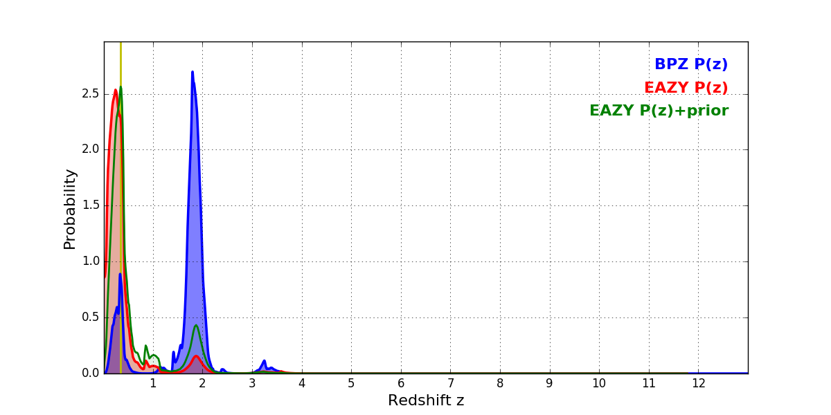 In P(z) plots: Yellow lines mark the cluster redshift z = 0.341,