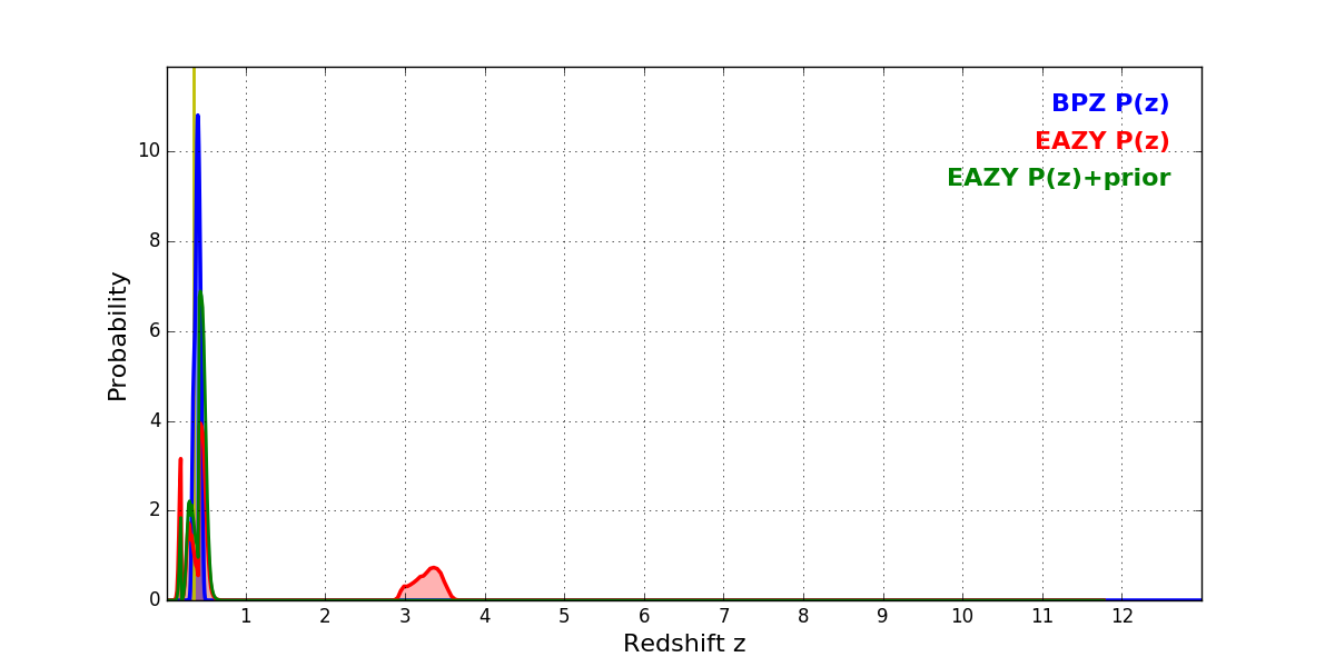 In P(z) plots: Yellow lines mark the cluster redshift z = 0.341,