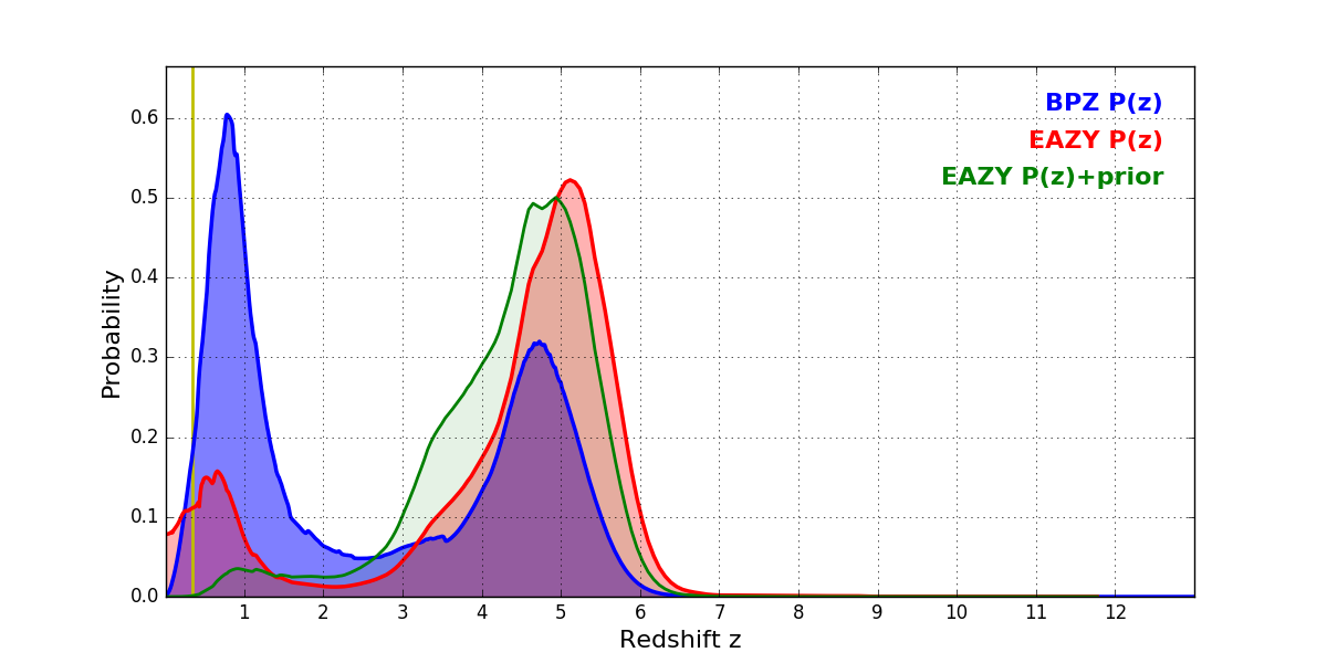 In P(z) plots: Yellow lines mark the cluster redshift z = 0.341,