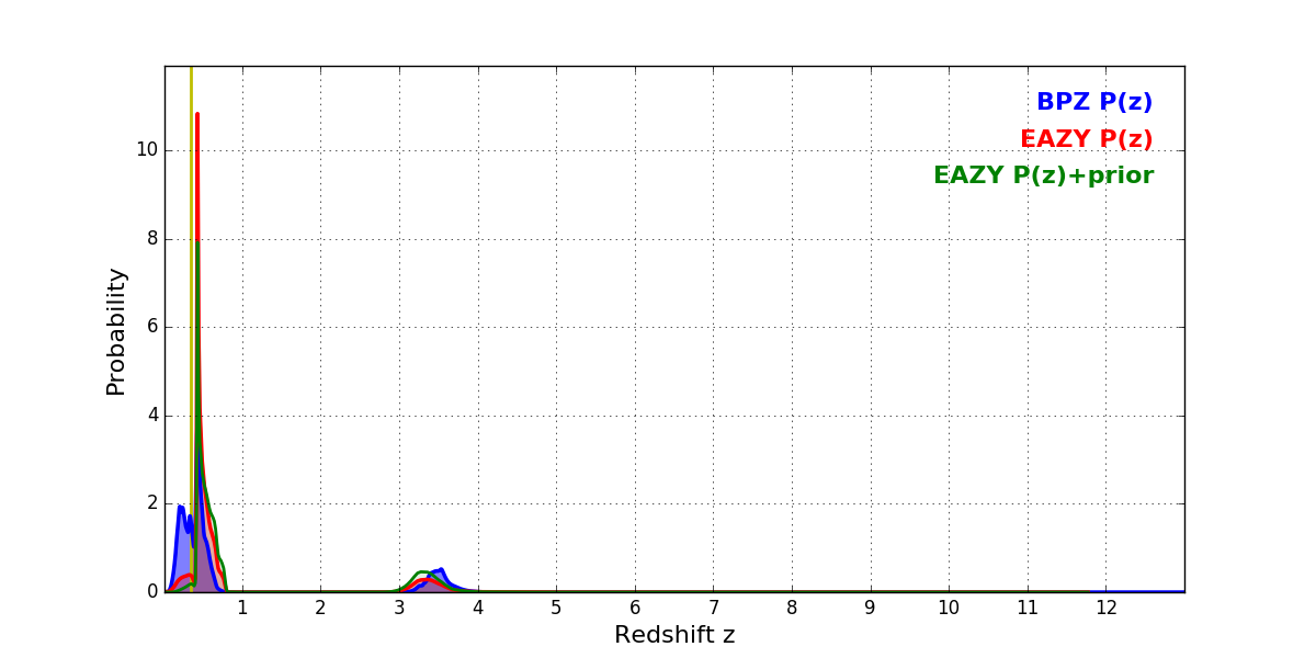 In P(z) plots: Yellow lines mark the cluster redshift z = 0.341,