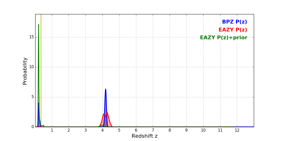 In P(z) plots: Yellow lines mark the cluster redshift z = 0.341,