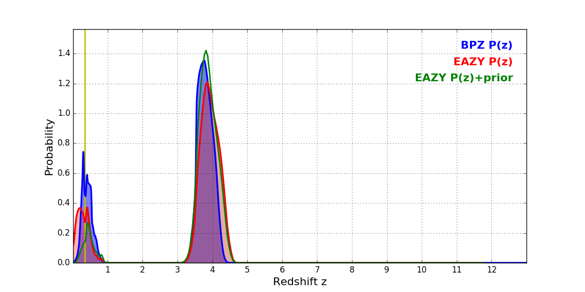 In P(z) plots: Yellow lines mark the cluster redshift z = 0.341,