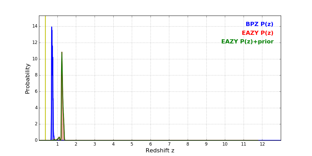 In P(z) plots: Yellow lines mark the cluster redshift z = 0.341,