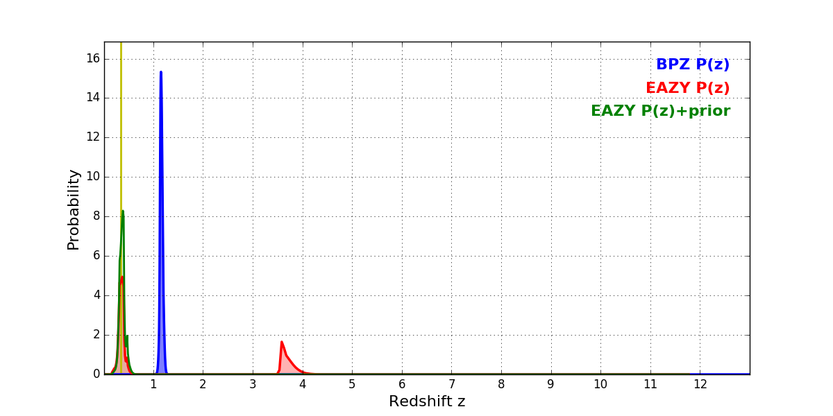 In P(z) plots: Yellow lines mark the cluster redshift z = 0.341,