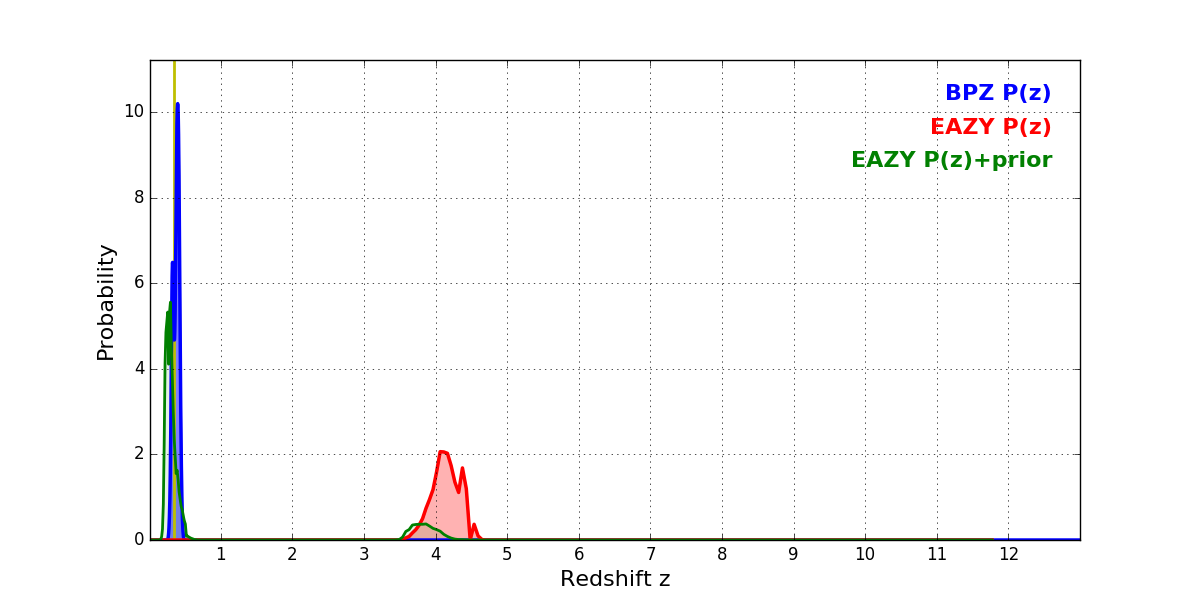 In P(z) plots: Yellow lines mark the cluster redshift z = 0.341,