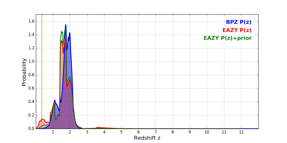In P(z) plots: Yellow lines mark the cluster redshift z = 0.341,