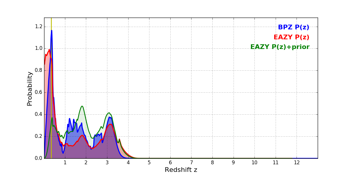 In P(z) plots: Yellow lines mark the cluster redshift z = 0.341,