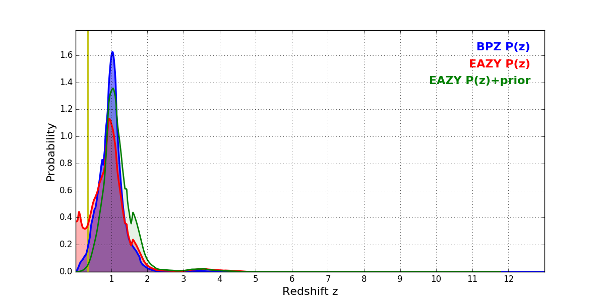 In P(z) plots: Yellow lines mark the cluster redshift z = 0.341,