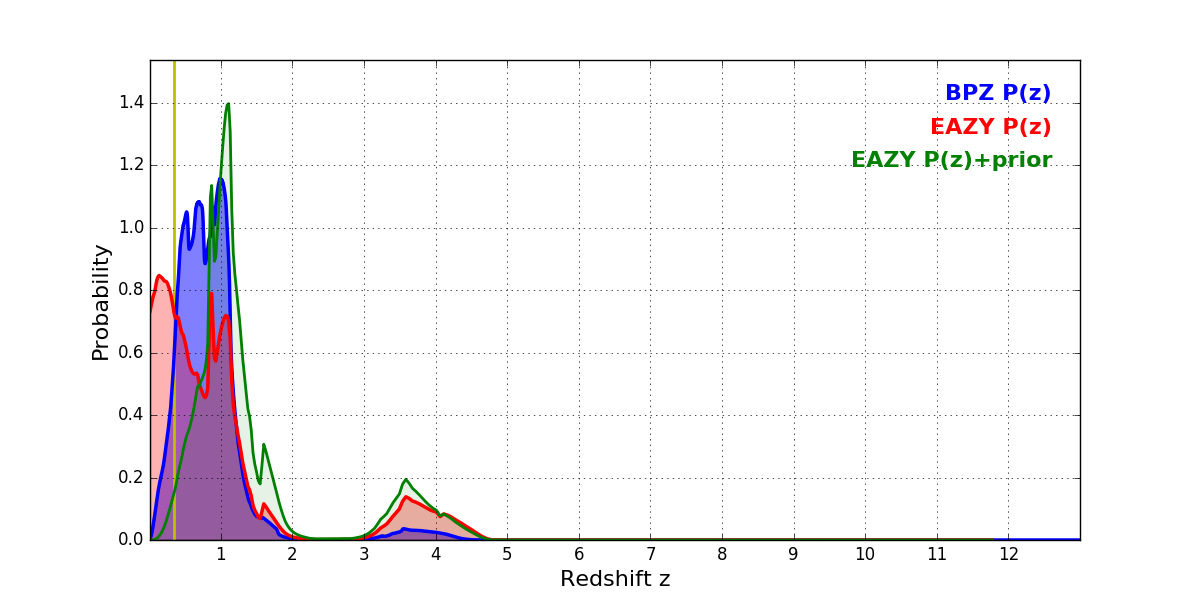 In P(z) plots: Yellow lines mark the cluster redshift z = 0.341,