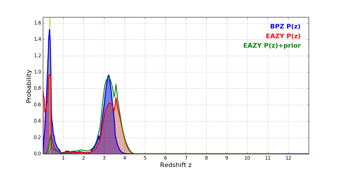 In P(z) plots: Yellow lines mark the cluster redshift z = 0.341,