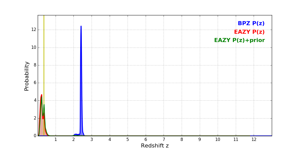 In P(z) plots: Yellow lines mark the cluster redshift z = 0.341,
