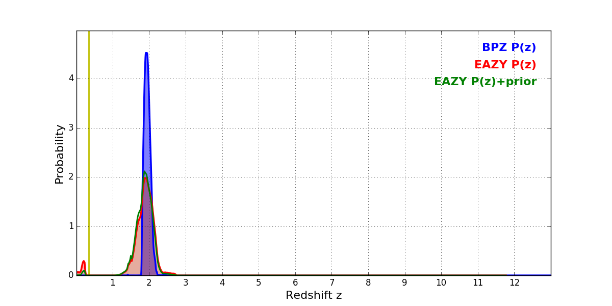 In P(z) plots: Yellow lines mark the cluster redshift z = 0.341,