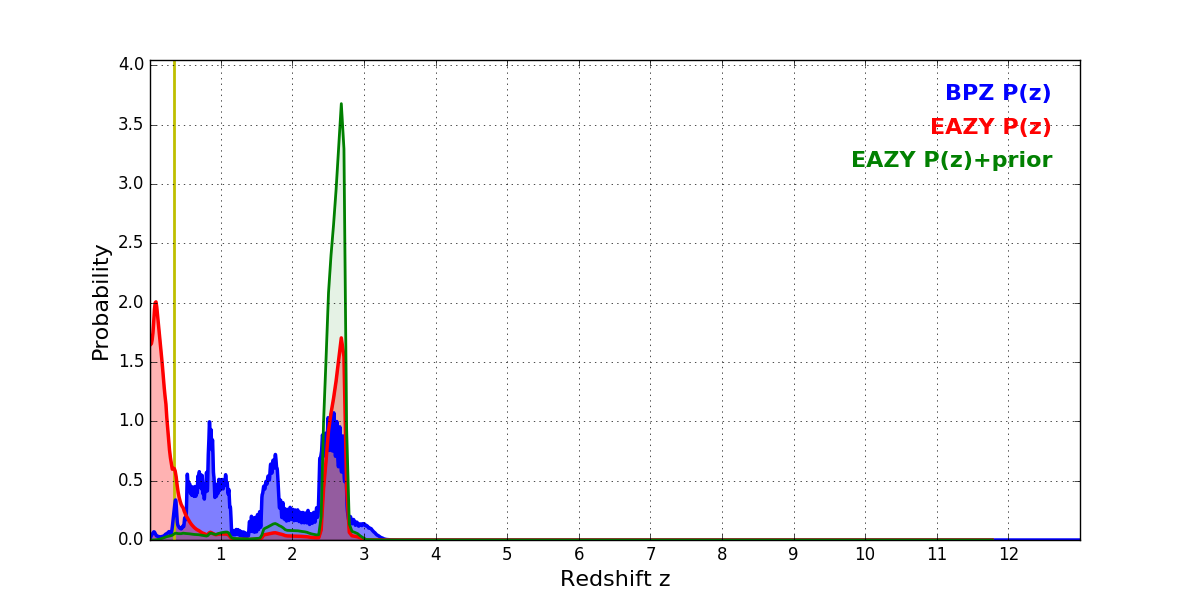 In P(z) plots: Yellow lines mark the cluster redshift z = 0.341,