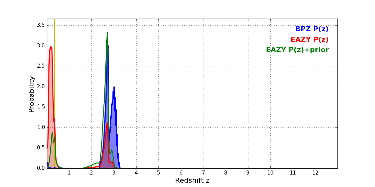 In P(z) plots: Yellow lines mark the cluster redshift z = 0.341,