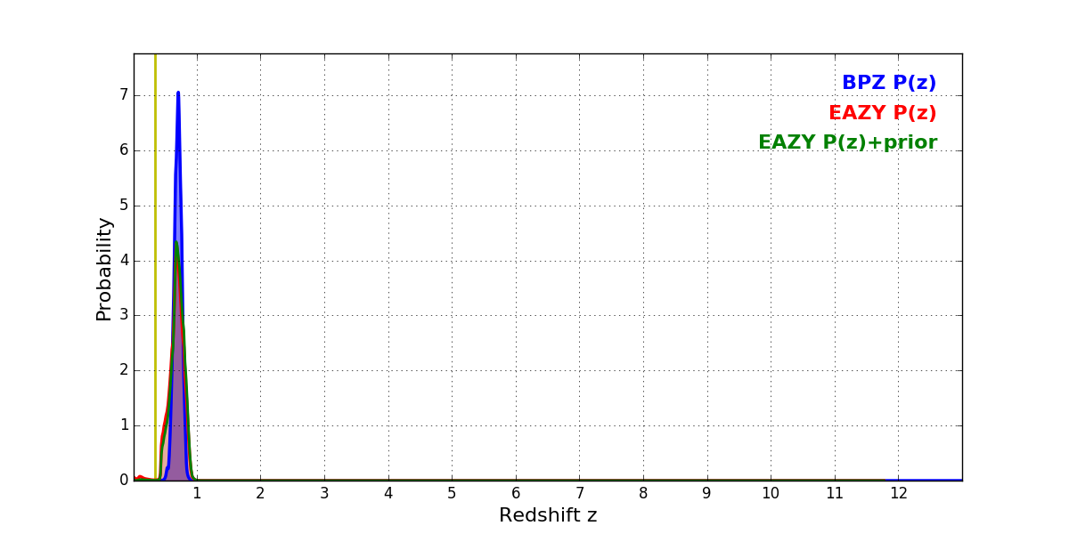 In P(z) plots: Yellow lines mark the cluster redshift z = 0.341,