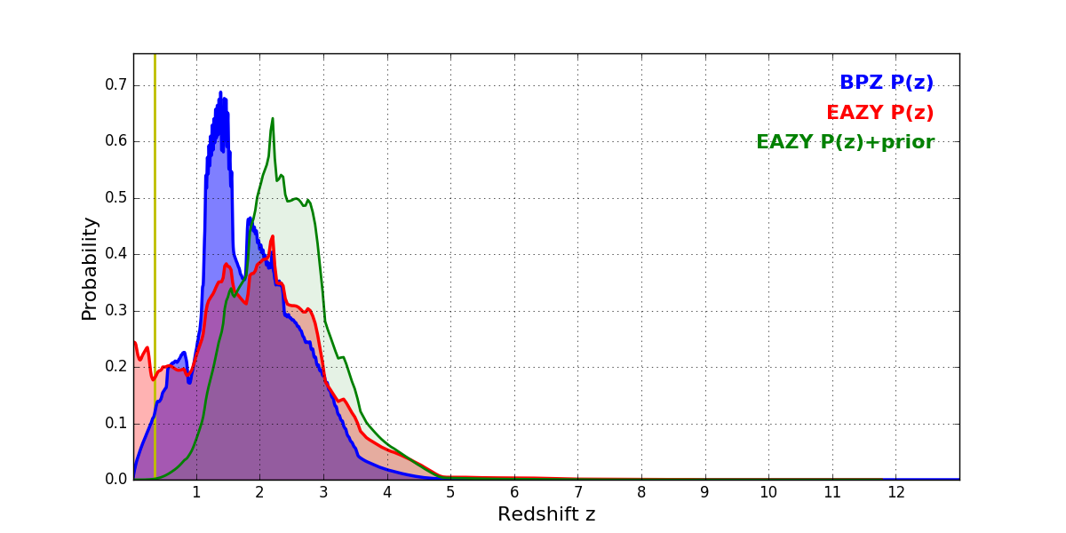 In P(z) plots: Yellow lines mark the cluster redshift z = 0.341,