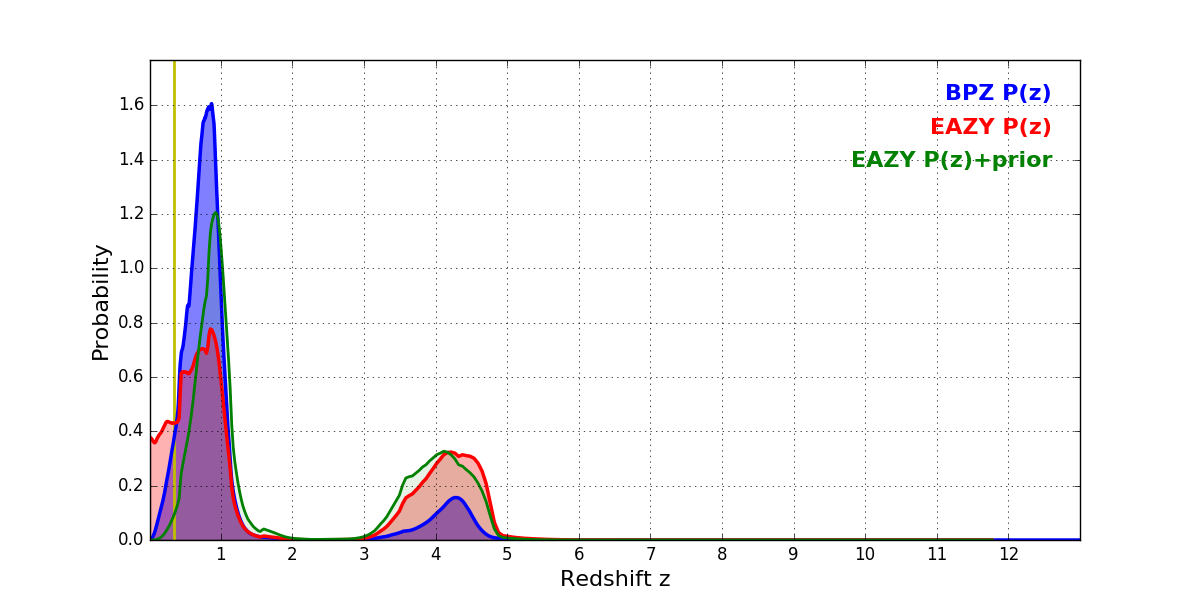 In P(z) plots: Yellow lines mark the cluster redshift z = 0.341,