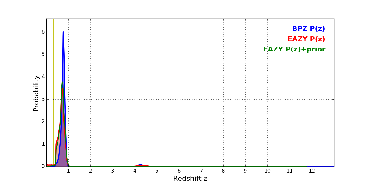 In P(z) plots: Yellow lines mark the cluster redshift z = 0.341,