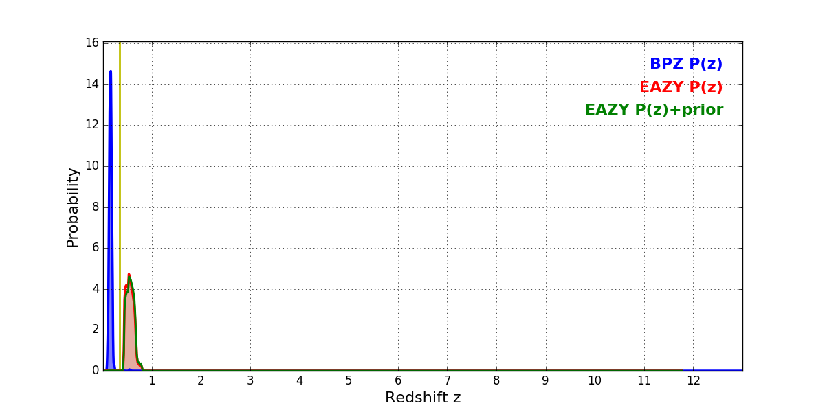 In P(z) plots: Yellow lines mark the cluster redshift z = 0.341,