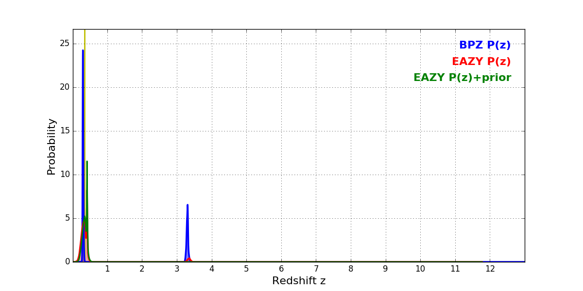 In P(z) plots: Yellow lines mark the cluster redshift z = 0.341,