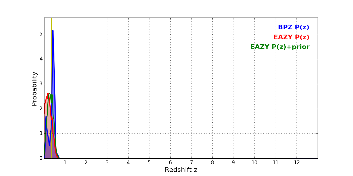 In P(z) plots: Yellow lines mark the cluster redshift z = 0.341,