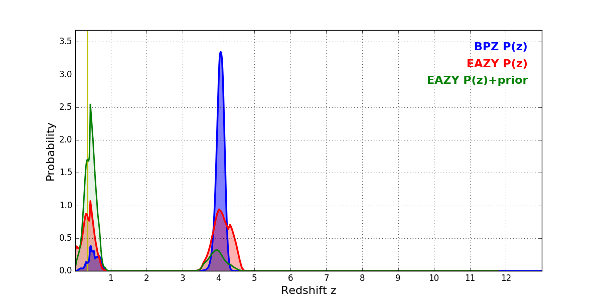 In P(z) plots: Yellow lines mark the cluster redshift z = 0.341,