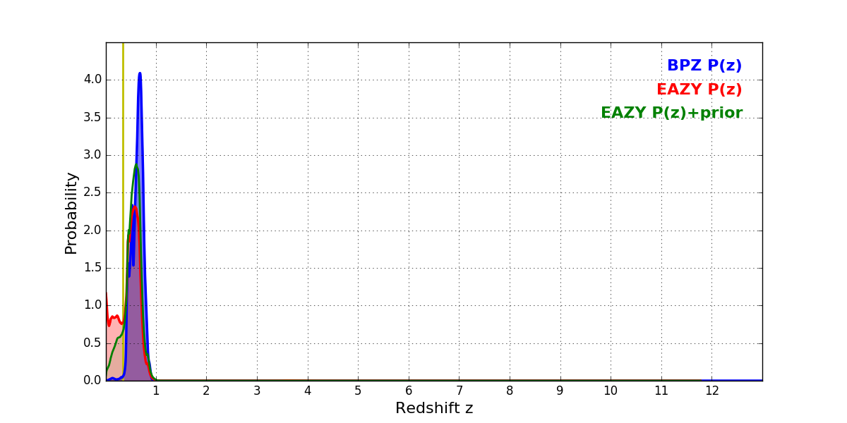 In P(z) plots: Yellow lines mark the cluster redshift z = 0.341,