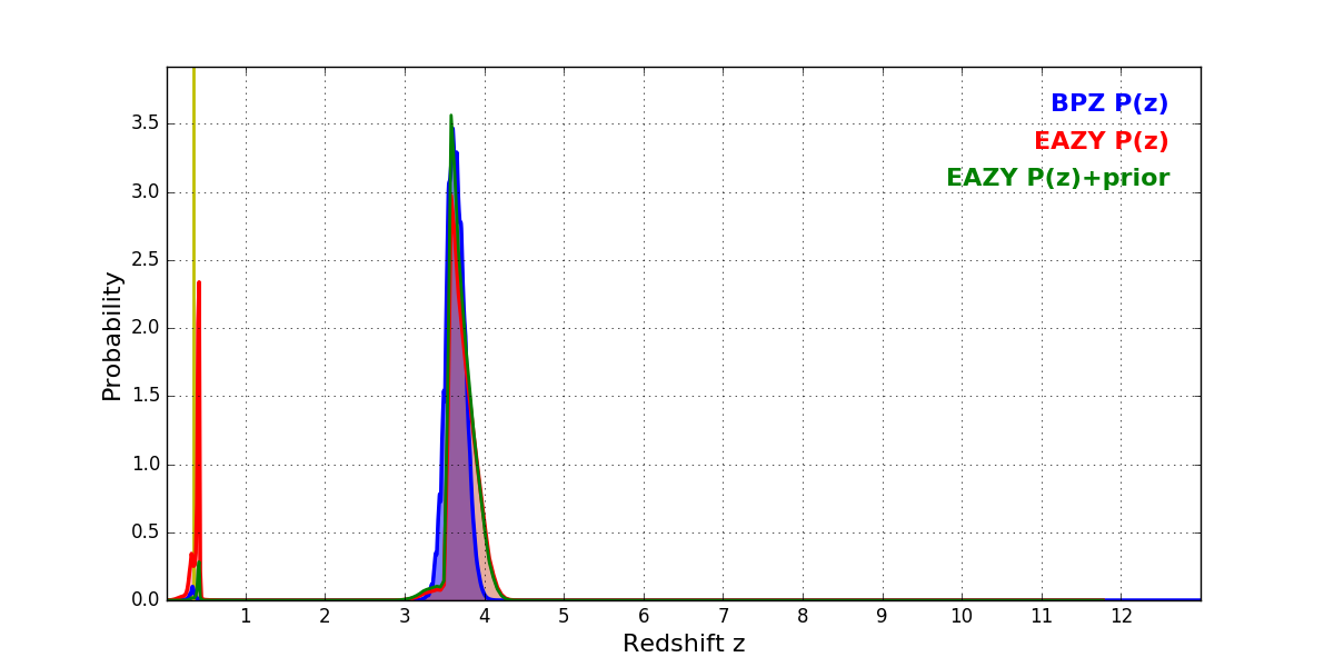 In P(z) plots: Yellow lines mark the cluster redshift z = 0.341,