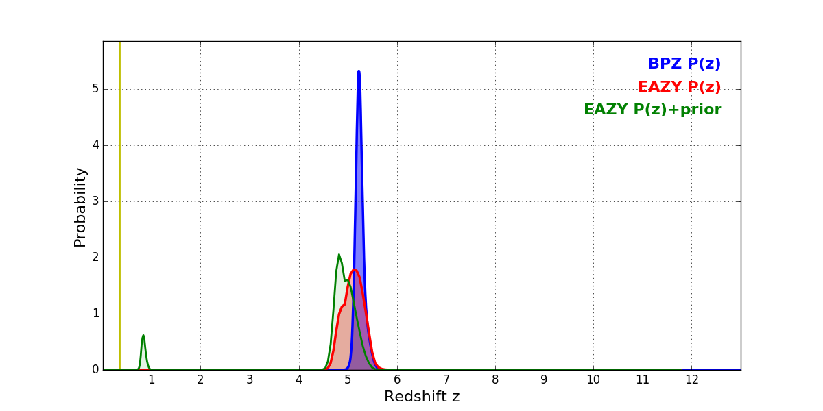 In P(z) plots: Yellow lines mark the cluster redshift z = 0.341,