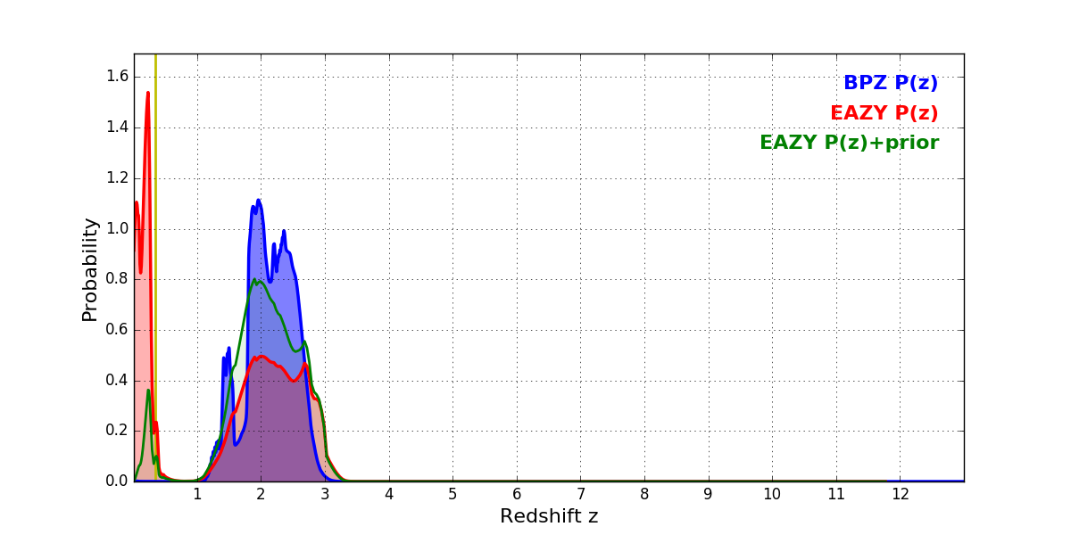 In P(z) plots: Yellow lines mark the cluster redshift z = 0.341,