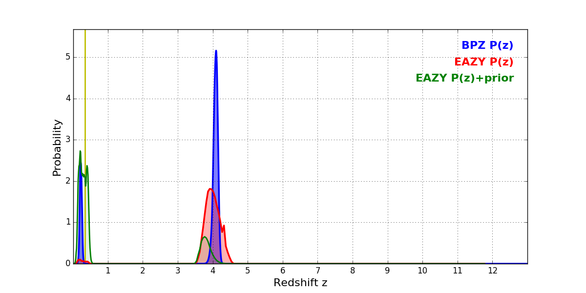 In P(z) plots: Yellow lines mark the cluster redshift z = 0.341,
