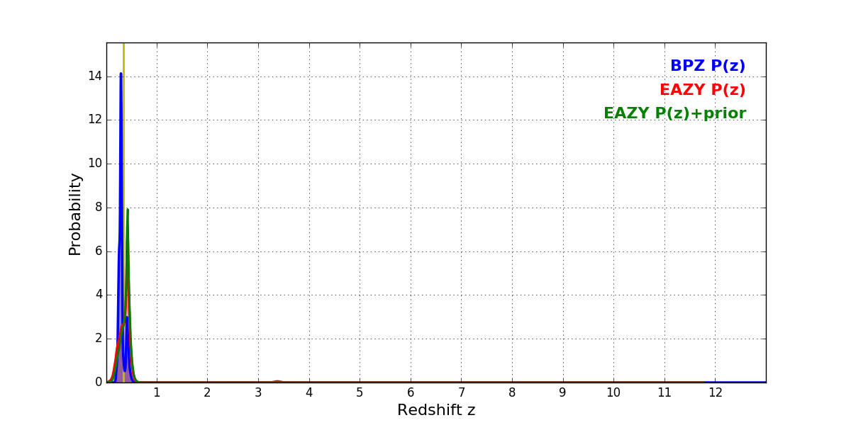 In P(z) plots: Yellow lines mark the cluster redshift z = 0.341,