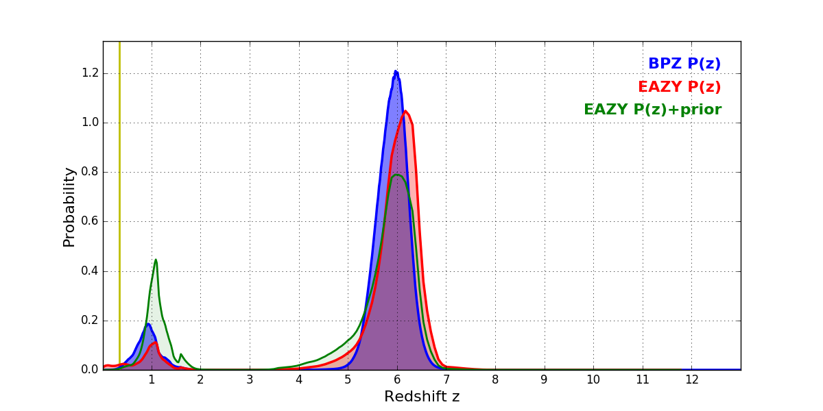 In P(z) plots: Yellow lines mark the cluster redshift z = 0.341,