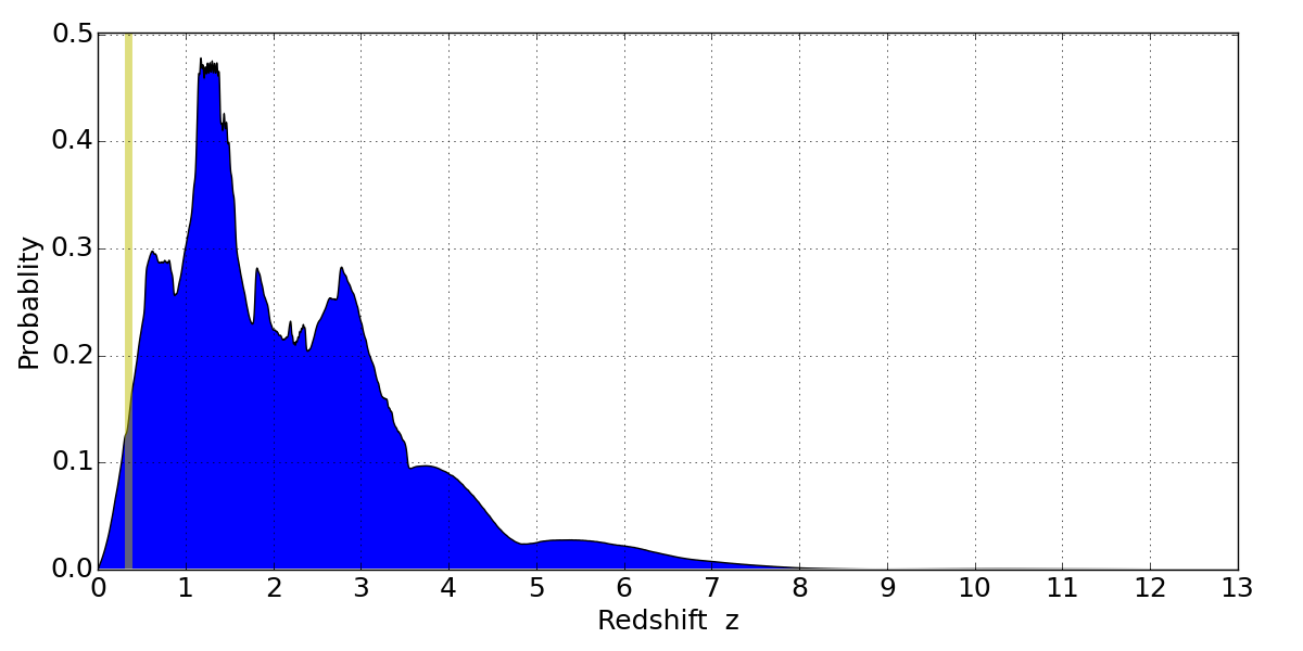In P(z) plots: Yellow lines mark the cluster redshift z = 0.341,