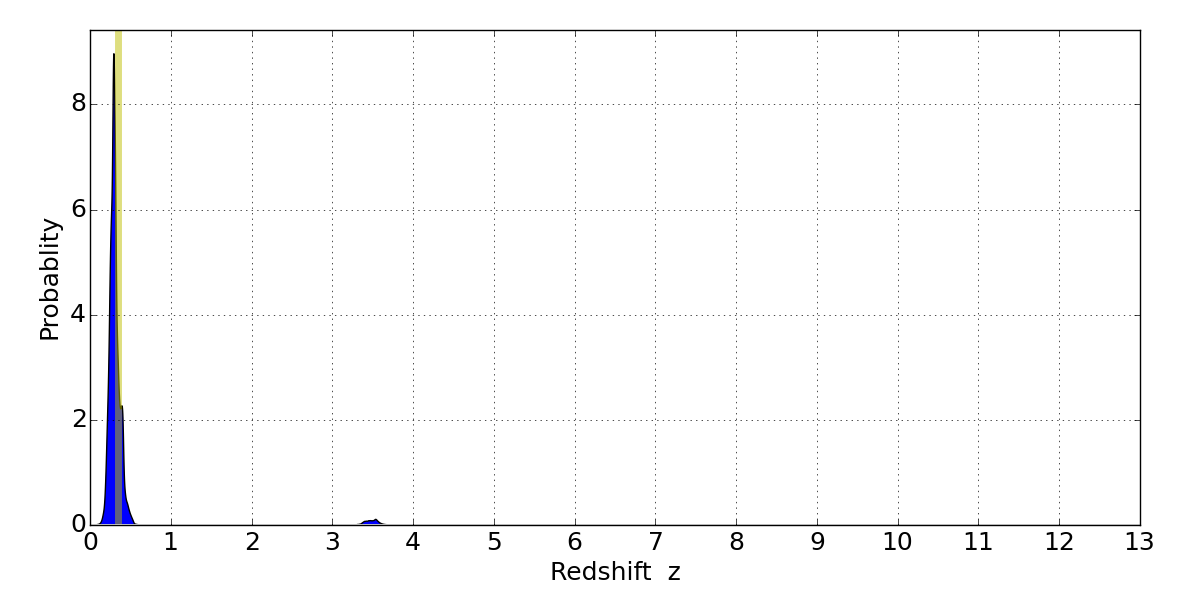 In P(z) plots: Yellow lines mark the cluster redshift z = 0.341,