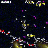 Object #1197 x,y = (2632, 3499) RA, Dec = (02:32:17.592, -44:19:42.24) = (38.07330, -44.32840) BPZ = 0.291 [0.228--0.773] type = 8.20 (SB1_B10 - SB2_B10) chisq2 = 0.36 ODDS = 0.41 z_cluster = 0.284
