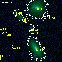 Object #1268 x,y = (1620, 3456) RA, Dec = (02:32:23.232, -44:19:44.76) = (38.09680, -44.32910) BPZ = 1.408 [0.145--3.154] type = 8.70 (SB2_B10 - SB1_B10) chisq2 = 0.00 ODDS = 0.09 z_cluster = 0.284