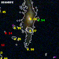 Object #4208 x,y = (2675, 1813) RA, Dec = (02:32:17.352, -44:21:23.40) = (38.07230, -44.35650) BPZ = 0.366 [0.144--0.787] type = 9.00 (SB2_B10) chisq2 = 0.13 ODDS = 0.27 z_cluster = 0.284