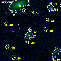 Object #5403 x,y = (3528, 1136) RA, Dec = (02:32:12.576, -44:22:04.08) = (38.05240, -44.36780) BPZ = 1.398 [0.152--3.203] type = 8.20 (SB1_B10 - SB2_B10) chisq2 = 0.00 ODDS = 0.08 z_cluster = 0.284