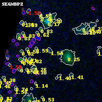 Object #60 x,y = (1454, 4626) RA, Dec = (02:32:24.168, -44:18:34.56) = (38.10070, -44.30960) BPZ = 1.539 [0.193--3.000] type = 9.50 (SB3_B10 - SB2_B10) chisq2 = 0.00 ODDS = 0.10 z_cluster = 0.284