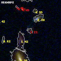 Object #456 x,y = (3559, 2367) RA, Dec = (02:32:12.384, -44:20:49.92) = (38.05160, -44.34720) BPZ = 1.205 [1.037--1.454] type = 7.60 (SB1_B10 - Scd_B10) chisq2 = 1.02 ODDS = 0.64 z_cluster = 0.284
