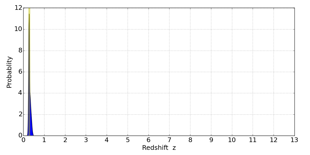 In P(z) plots: Yellow lines mark the cluster redshift z = 0.284,