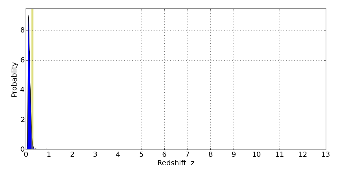 In P(z) plots: Yellow lines mark the cluster redshift z = 0.284,