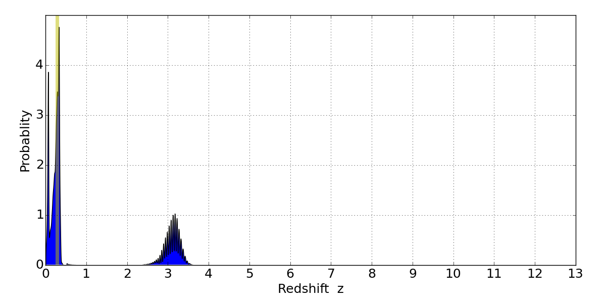 In P(z) plots: Yellow lines mark the cluster redshift z = 0.284,