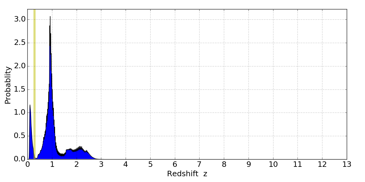 In P(z) plots: Yellow lines mark the cluster redshift z = 0.284,